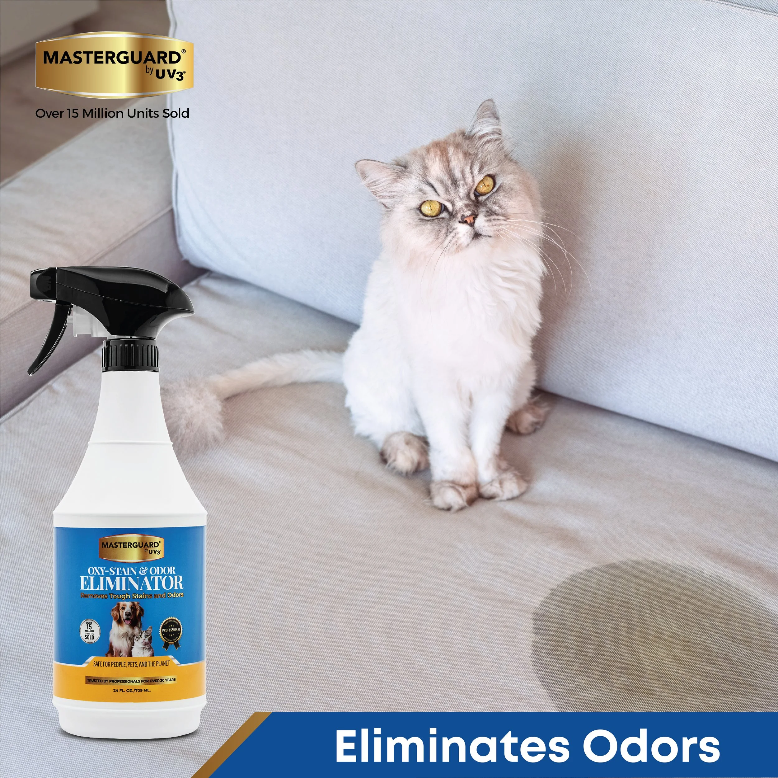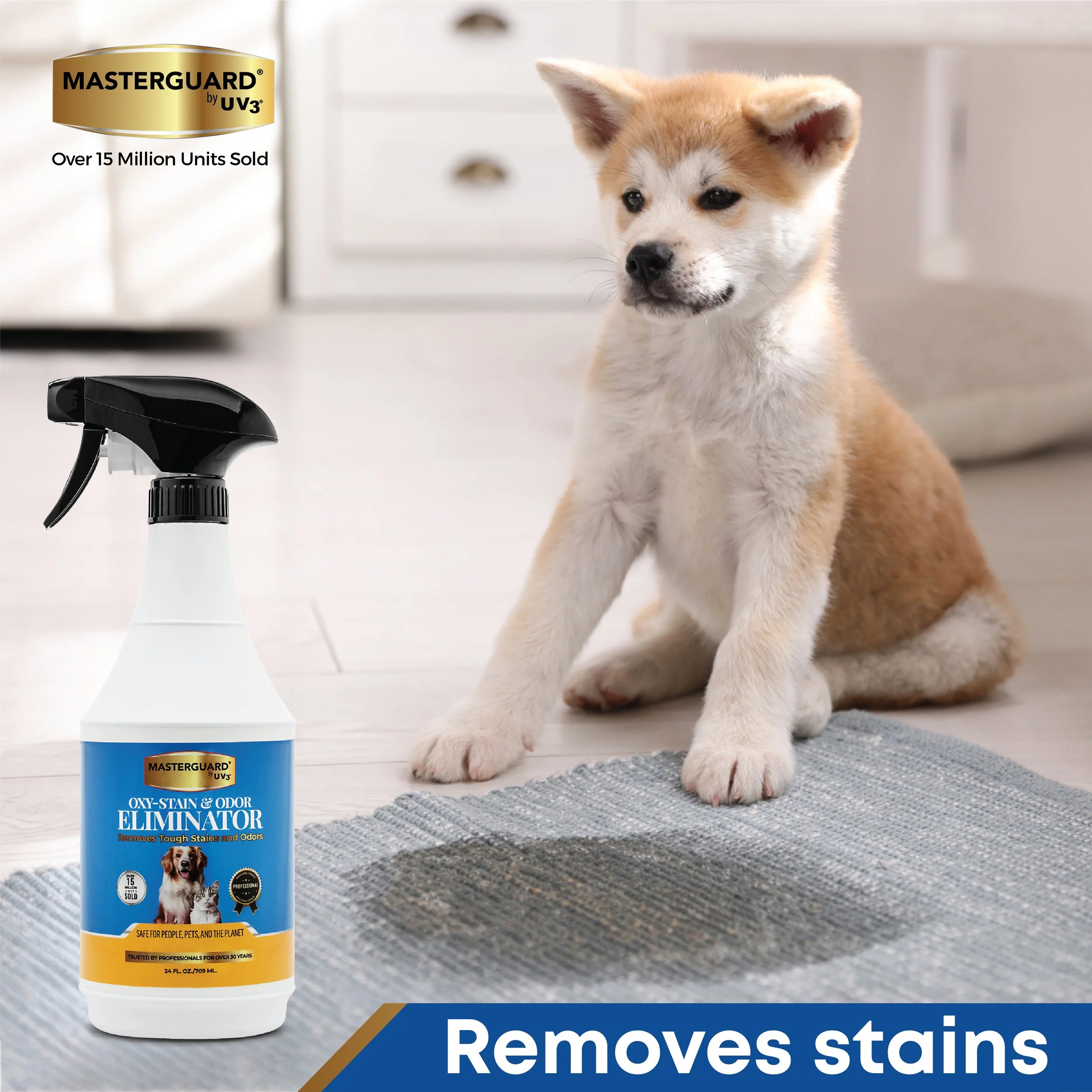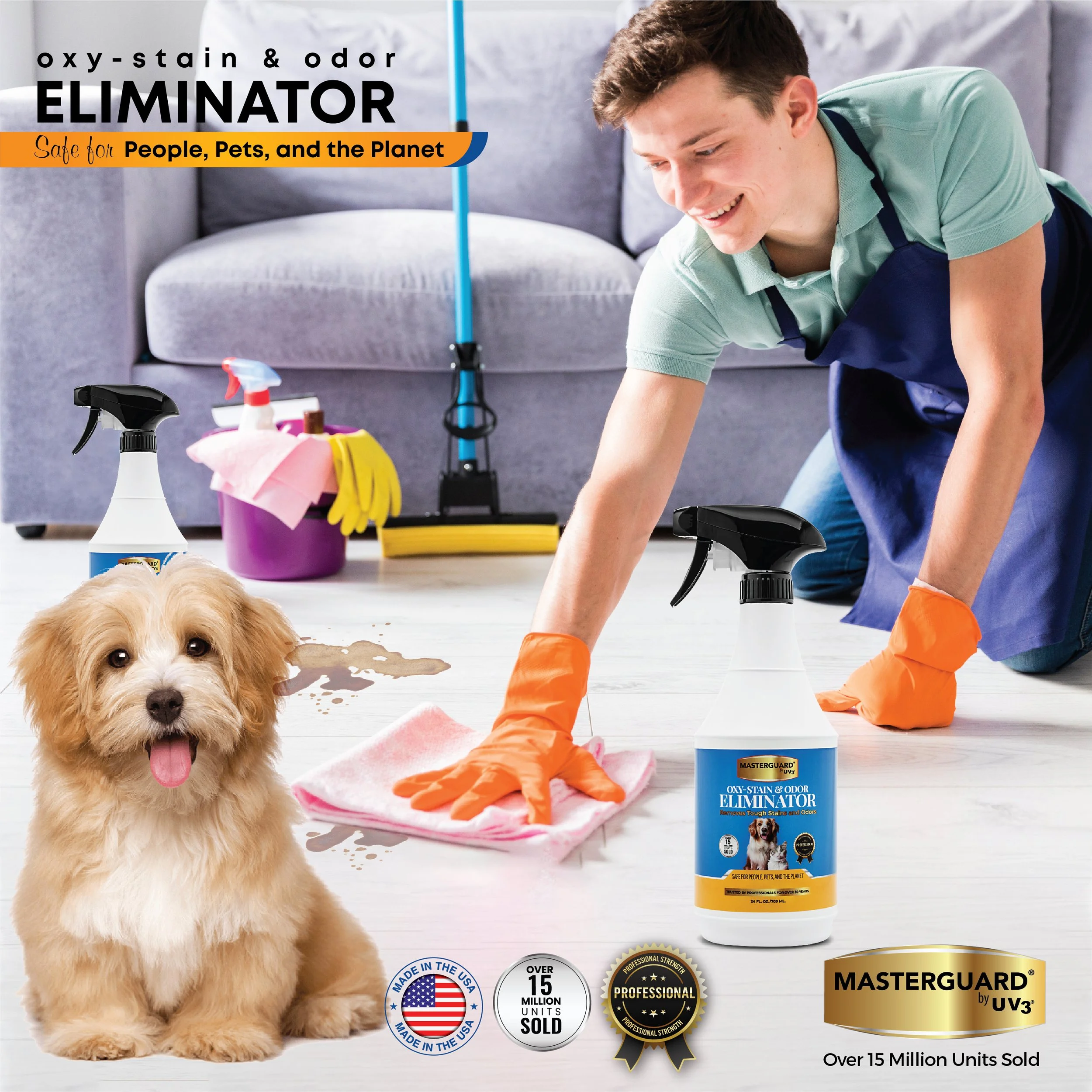Our Masterguard Oxy-Stain and Odor Eliminator Spray is a powerful solution designed to tackle the toughest pet stains and odors, as well as spills from food and beverages. Its advanced formula effectively lifts and removes stains from fabrics, carpets, apparel, shoes, and various surfaces, ensuring your home stays fresh and clean. Best of all, our spray is safe for people, pets, and the planet, allowing you to maintain a pristine environment without compromising your family's health or the earth’s well-being.